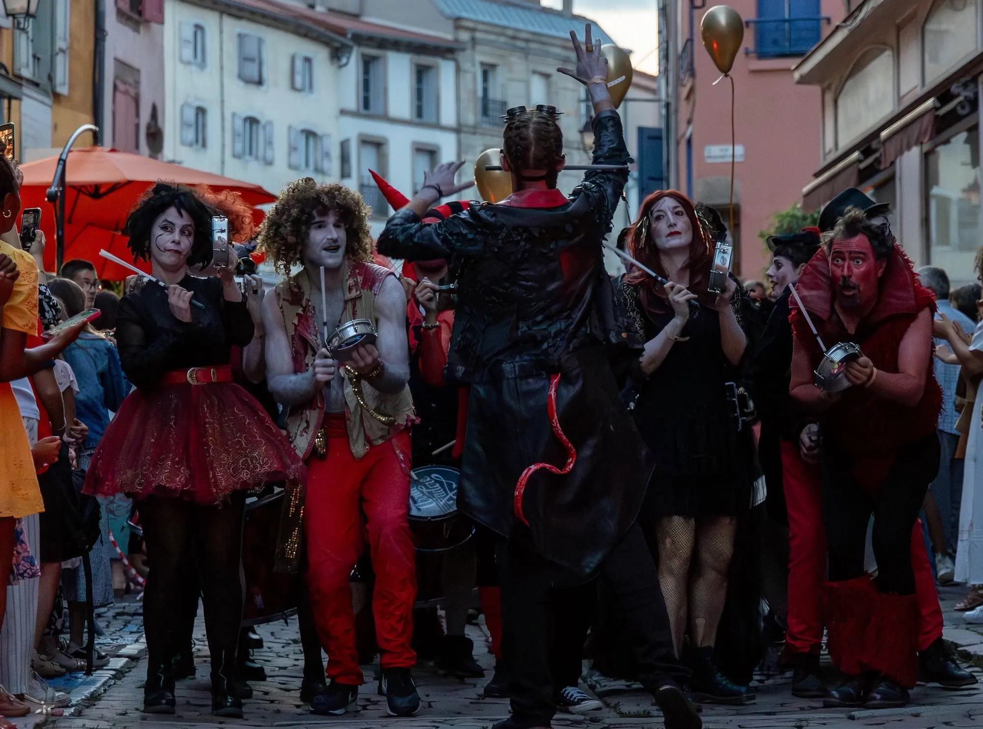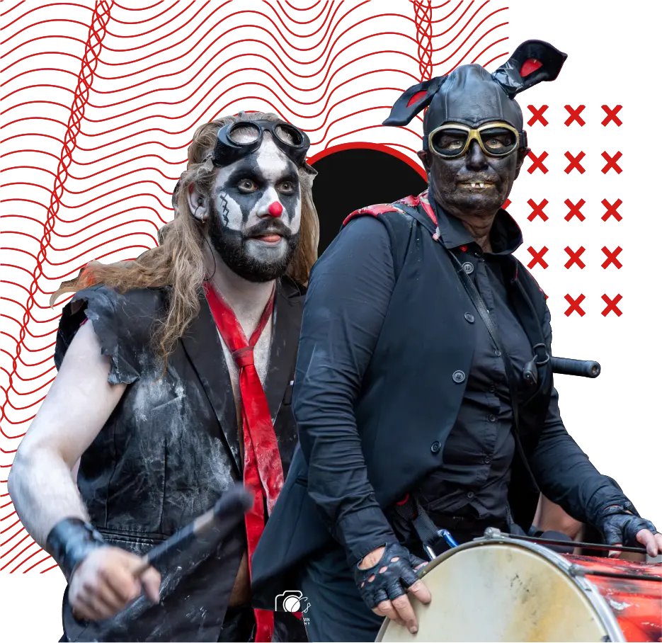 Un coup de tonnerre qui s’abat sur l’asphalte ! En rouge et noir, nos diables déchaînés débarquent, refusés aux portes des Enfers pour manque de vice… Mais bien décidés à embraser vos rues autrement : par la puissance du samba.